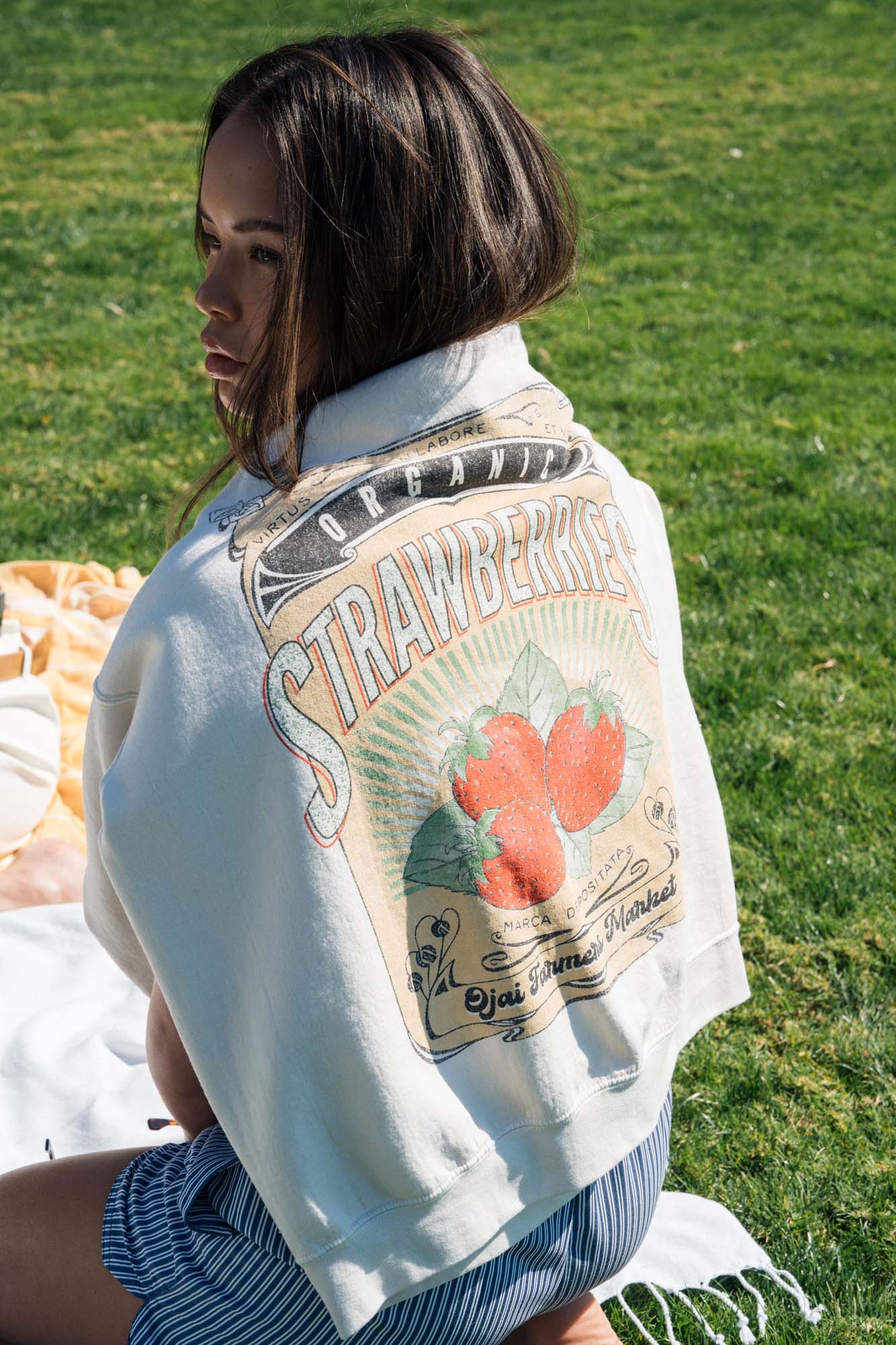 The Strawberries Oversized Sweatshirt features our signature fleece sweatshirt with drop shoulders and an overall relaxed fit. The graphic is intentionally faded, meant to look like a vintage find from your favorite fruit vendor. Pair with a trendy boxer short to go support your local farmers.