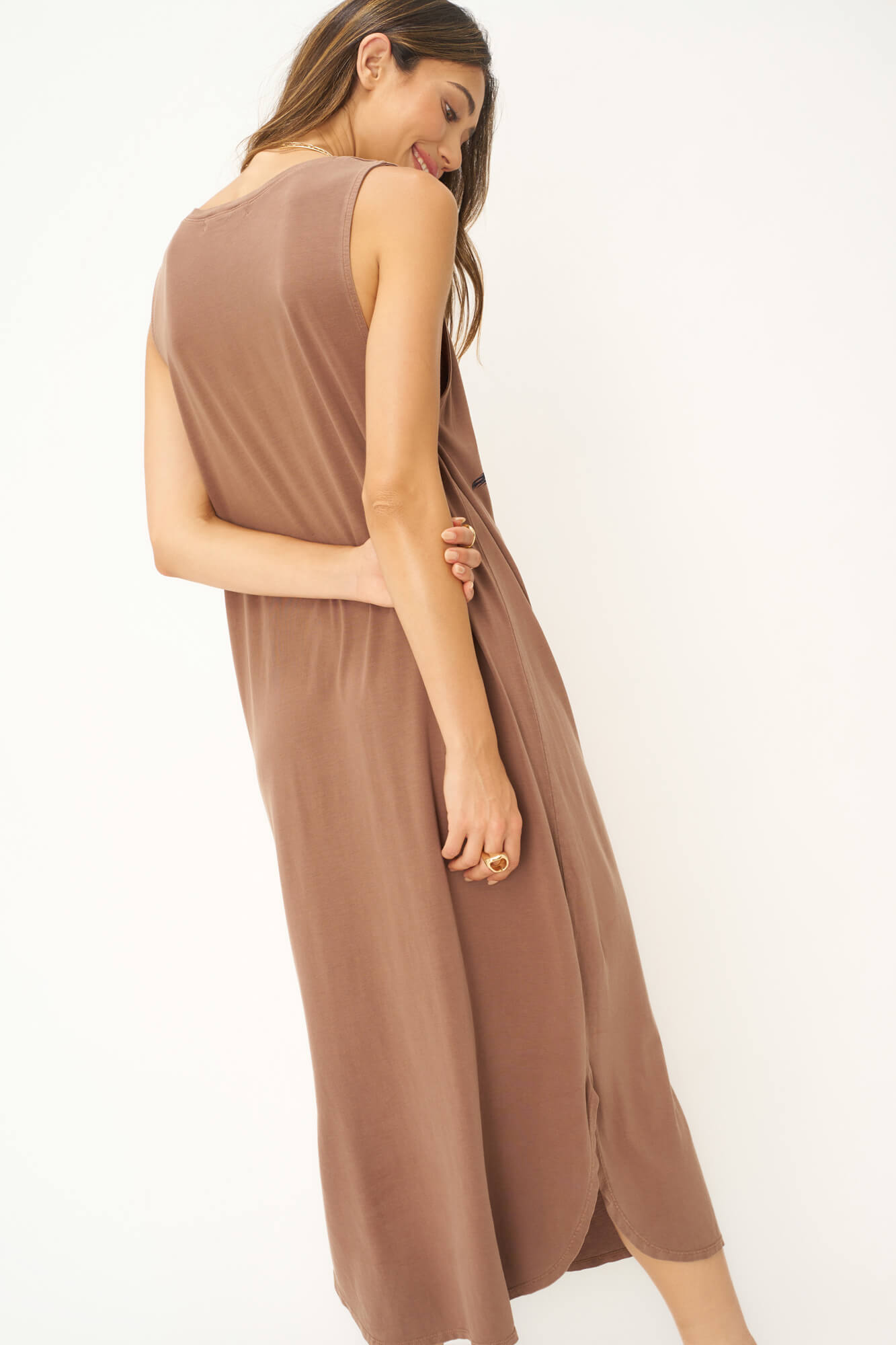 The Agua Dulce Tank Dress is the perfectly undone look you've been craving for weekend coffee runs, casual travel days, and beyond. Its midi length, relaxed fit, shirttail hemline, and muscle tee silhouette will have you looking effortlessly edgy all day long. The graphic is intentionally distressed, inspired by our weekend trips to the desert and days spent under the sun.