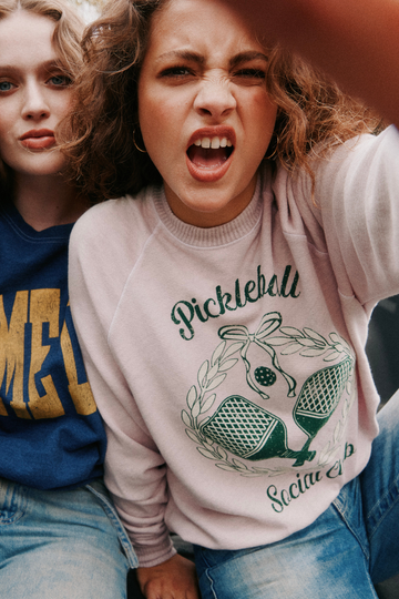 Pickleball Social Club Sweatshirt brings a playful twist to your off-duty lineup. Designed in a relaxed fit with a soft fleece interior, it features a vintage-inspired crest graphic of crossed paddles framed by leafy laurels and bold lettering, all set against a soft pink hue for that true club merch feel.