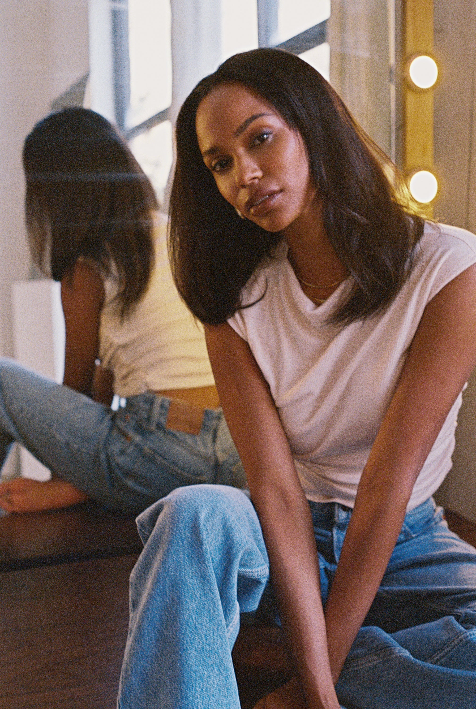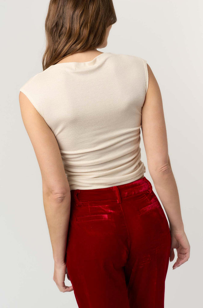 The Carine Tank is cut in a soft rib with an extended shoulder that gives it a subtle cap sleeve look. Shirred side seams and a layered front hem create a softly gathered shape through the waist. A simple tank with just enough detail.