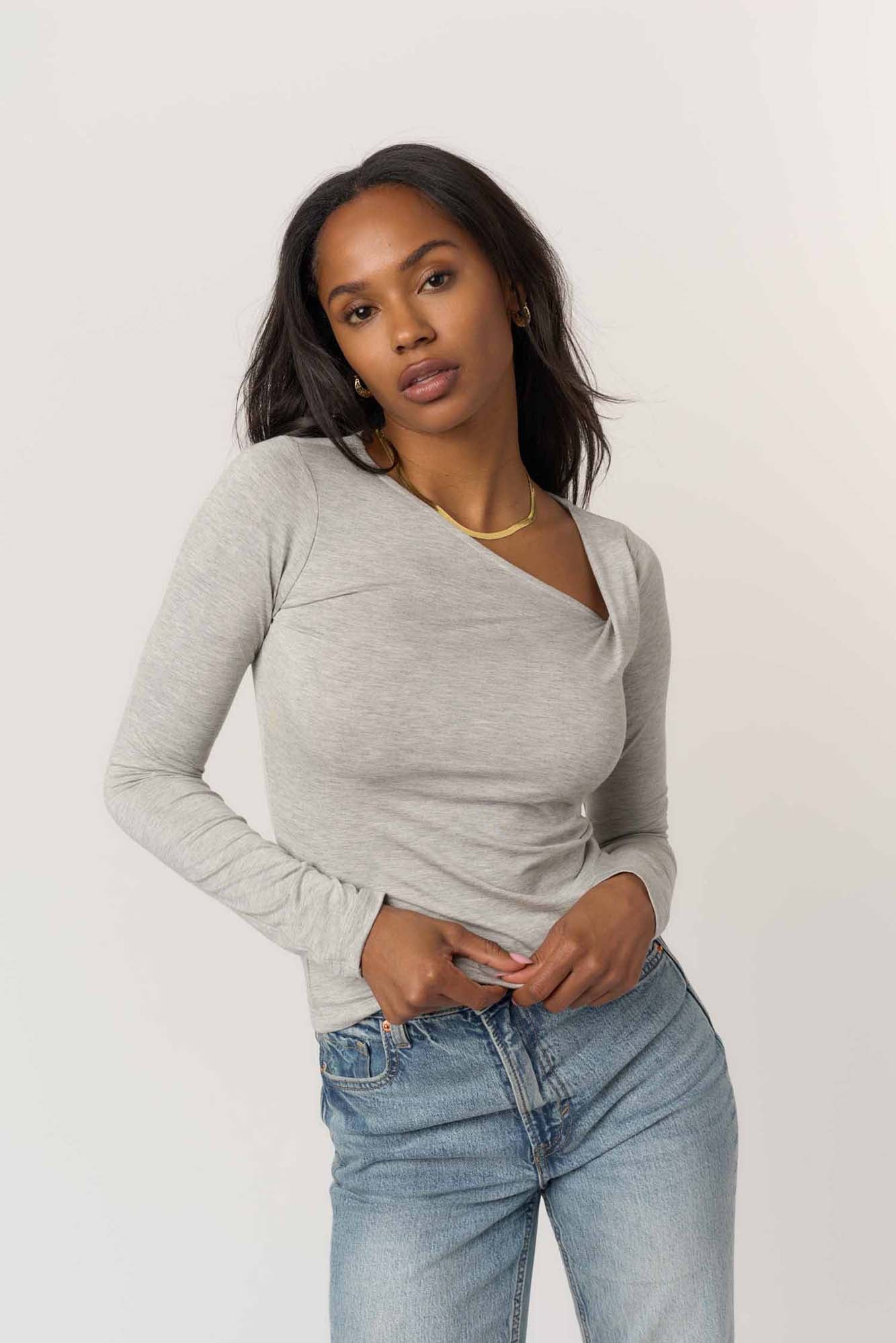The Rosa Longsleeve is made from a soft jersey and designed with an asymmetrical neckline that creates a subtle twist effect across the front. It features long sleeves and a smooth, body skimming fit that gives it a refined, modern look.