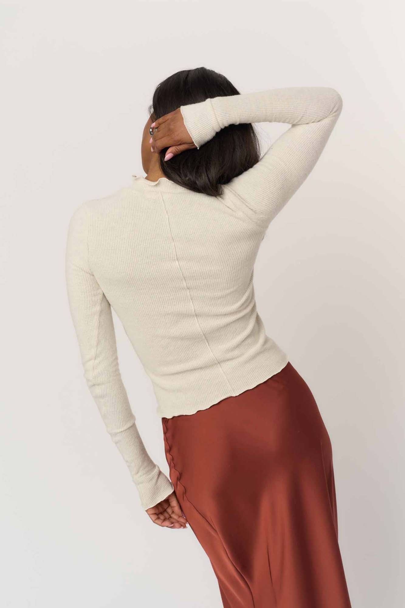 The Sloane Mock Neck is crafted in our soft cozy rib with a clean, fitted silhouette. It features a mock neckline, long sleeves, and merrow-edge finishing at the cuffs and hem. A simple essential with a subtle, feminine detail.