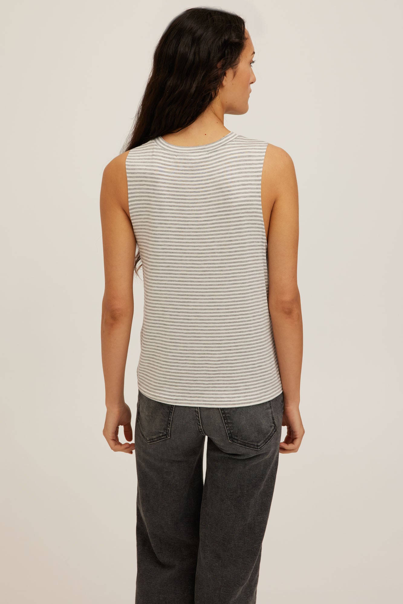 An effortless wardrobe staple. Made from an ultra-soft jersey that feels lightweight with subtle stretch. The Mixed Stripe Tank is designed with a classic crew neckline, low raw-edge armholes, and a hip-length cut. It holds an airy, easy shape with a smooth finish. Easy to tuck or wear casual.
