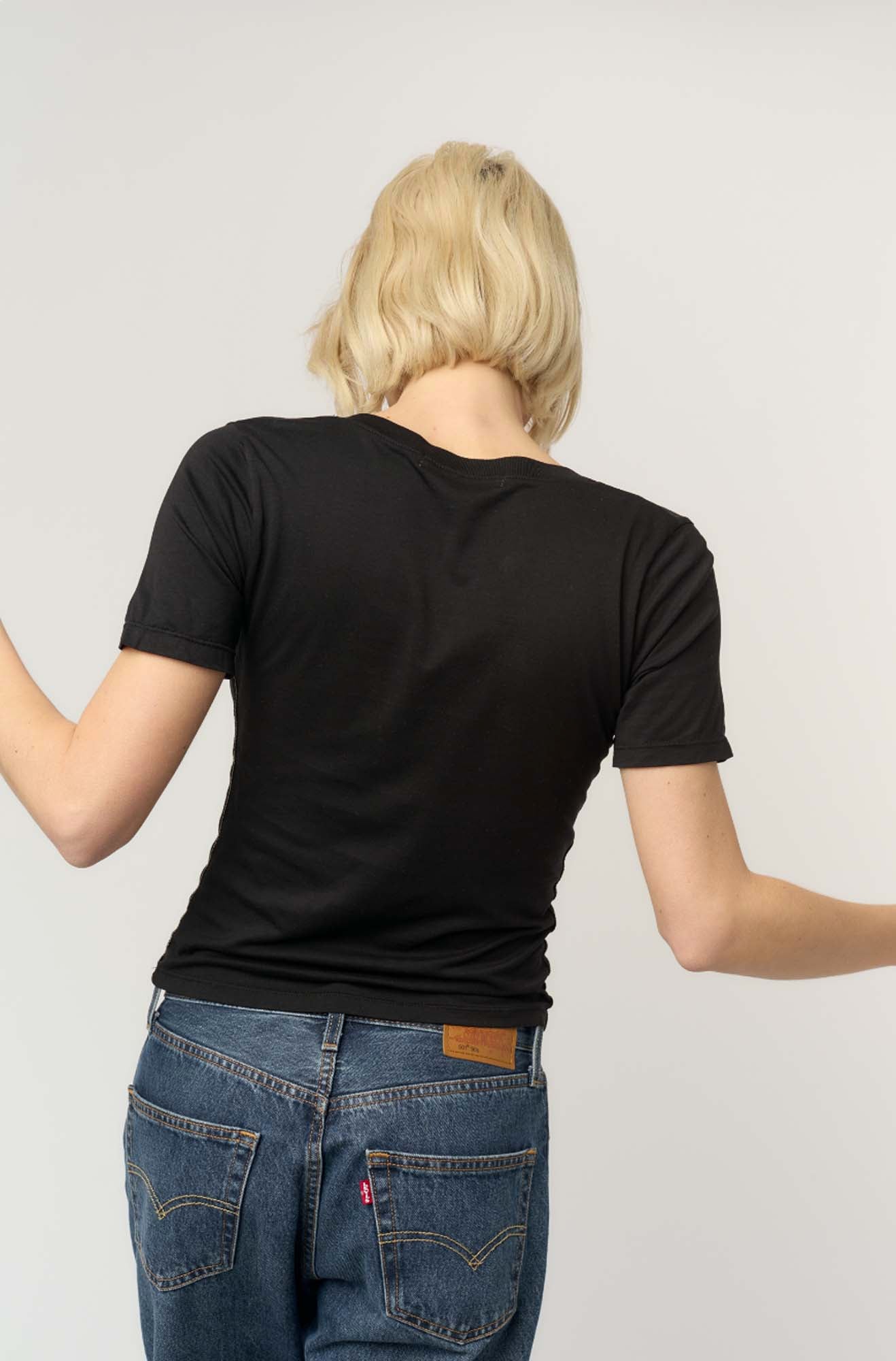 The It Girl Tee is made from a super soft jersey with a smooth, easy drape. It features a clean V neckline, short sleeves, and a body skimming fit. Finished with lurex twill tape along the side seams for a subtle touch of shine. A simple staple that pairs with everything.