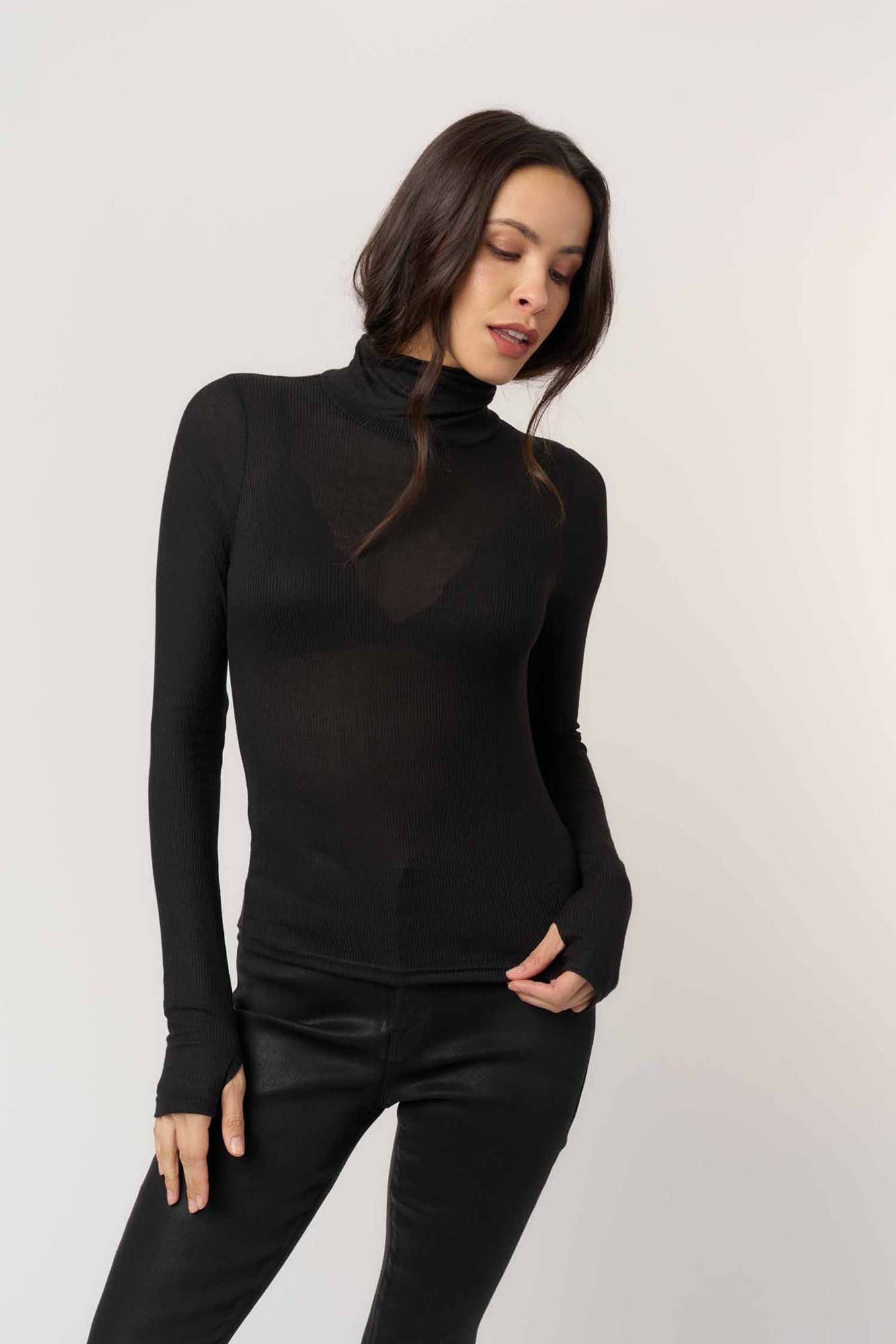 The Olive Turtleneck is cut in a soft fine rib with a smooth, close fit. It features a classic foldover neckline, long sleeves, and thumbhole cuffs for extra comfort. A sleek everyday essential that layers easily or stands on its own.