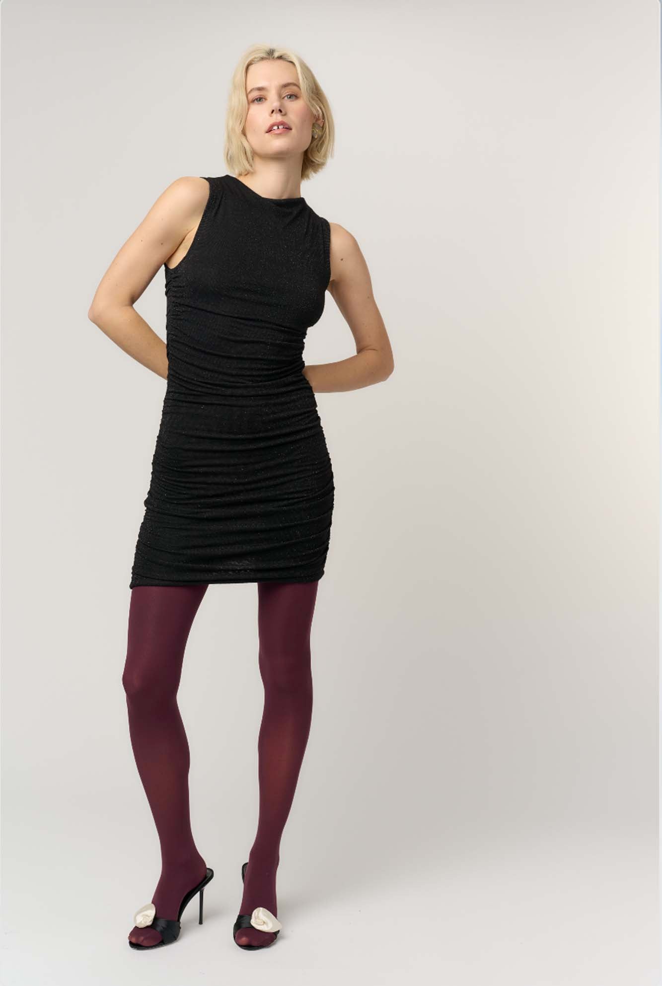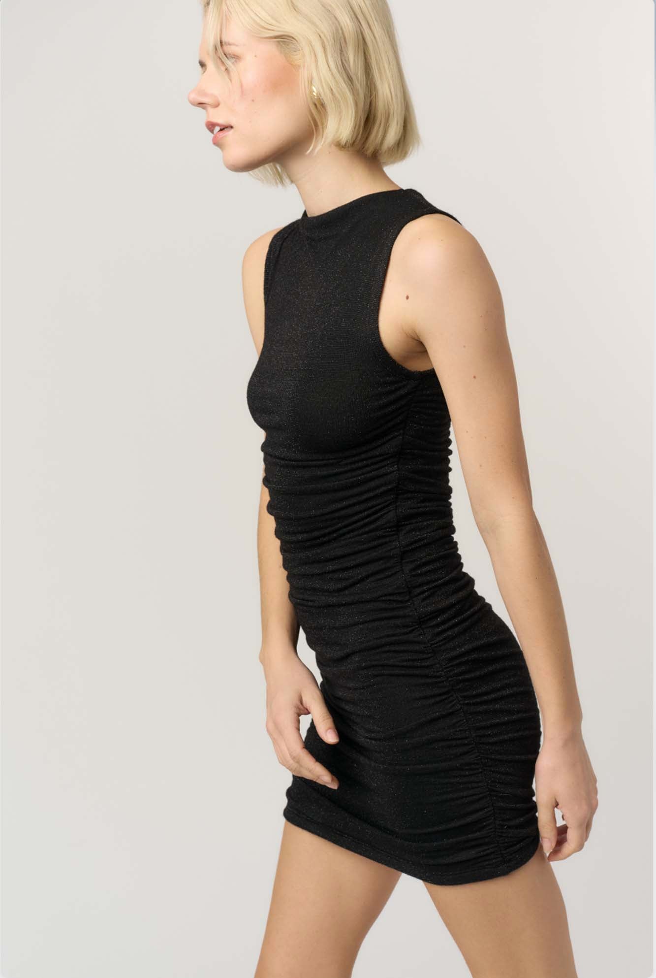 The In The Groove Dress is made from a soft lurex jersey with a subtle shimmer. It features a high neckline, sleeveless cut, and full side shirring that creates a textured, body-skimming silhouette. A polished, going-out look with an easy, modern feel.