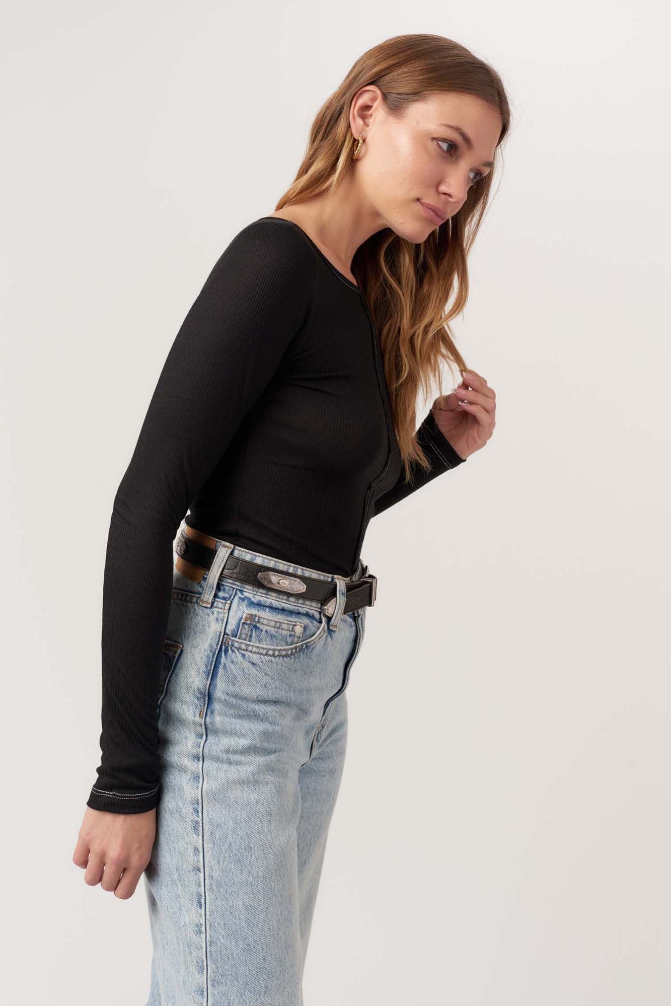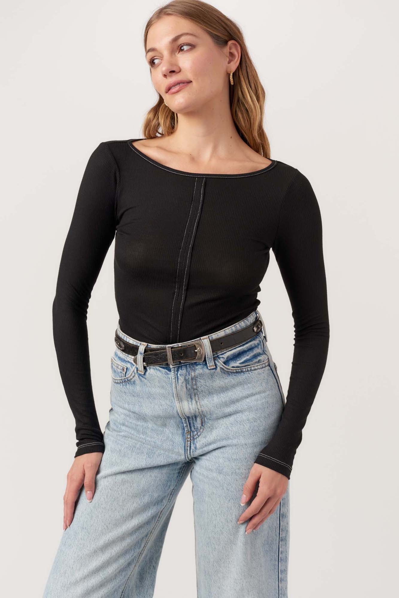 Yoko Seamed Boatneck Rib Long Sleeve - Black