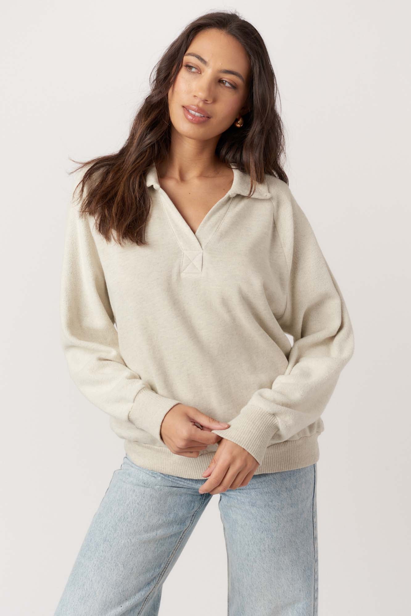Our Mari Mixed Fleece Pullover combines a smooth knit body with soft fleece sleeves for a cozy, layered feel. Designed with a collared V-notch neckline and finished with ribbed cuffs and hem, it’s the ideal pullover for cool nights and laid-back weekends.