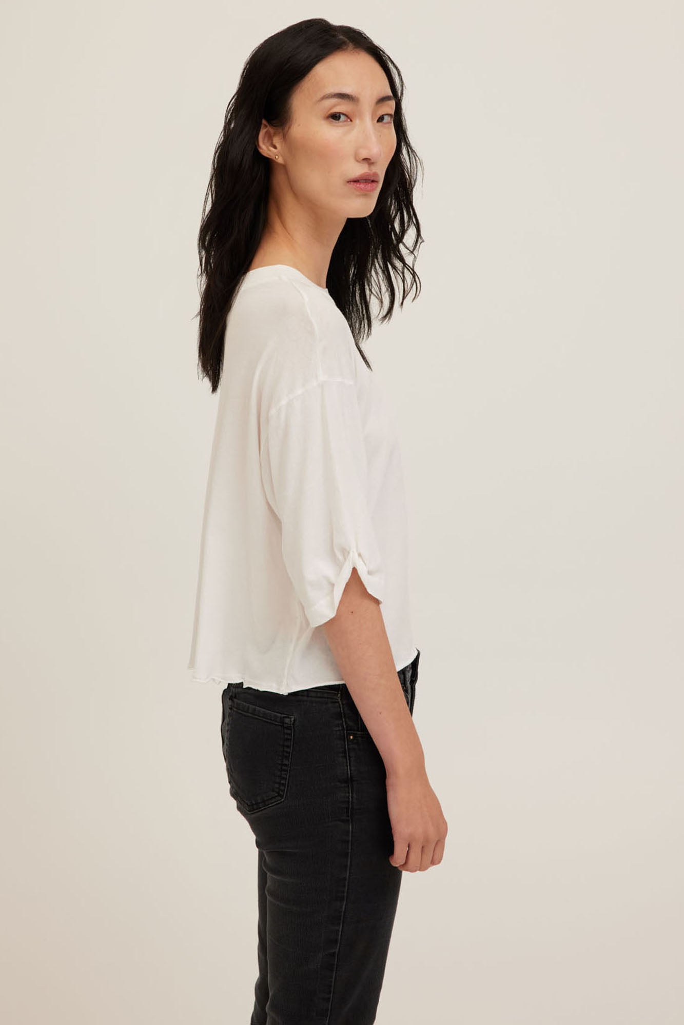 The elevated comfort staple. Made from a soft, lightweight jersey that feels breathable and easy to wear. The Izzy is designed with a contrast rib crew neckline, relaxed fit, a waist-length cut, and elbow sleeves, with pinned sleeves as a refined detail. It drapes with a wide yet structured look on the body. Effortless to dress up or down for a polished, put-together feel.