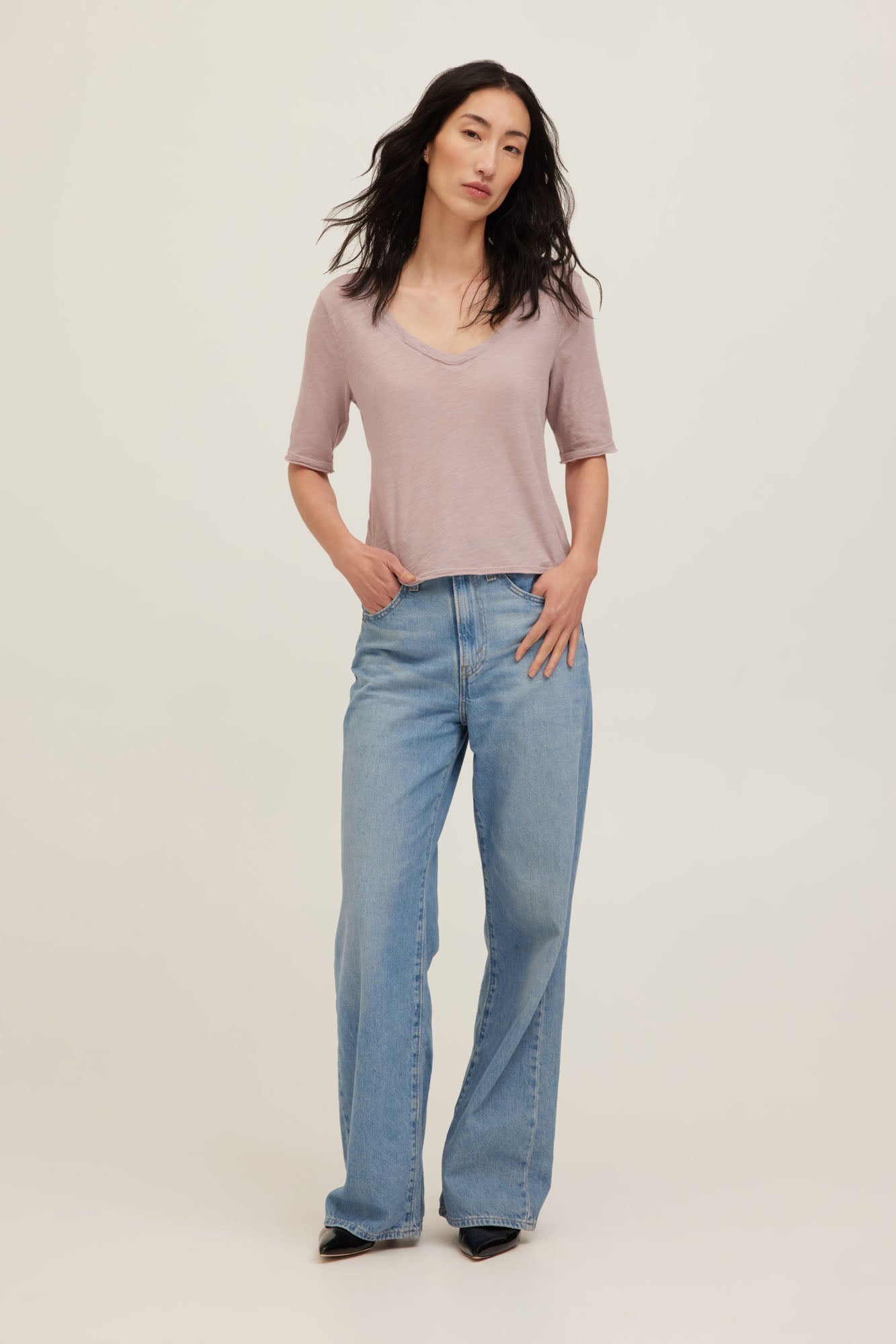 The comfortable everyday go-to. Made from a slub jersey that is ultra-light with a gently transparent finish and a touchably soft handfeel. The Jude Tee is designed with a wide, deep V-neck featuring cross-stitch detail, raw edges at the neckline and hem, elbow sleeves, and a waist-length cut. It drapes fluidly with a relaxed fit. Easy to layer or wear on its own and moves with you.