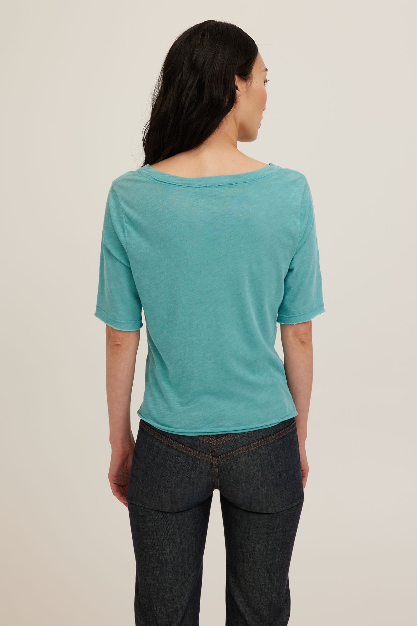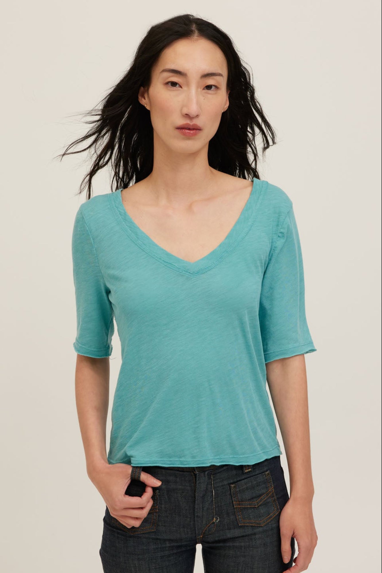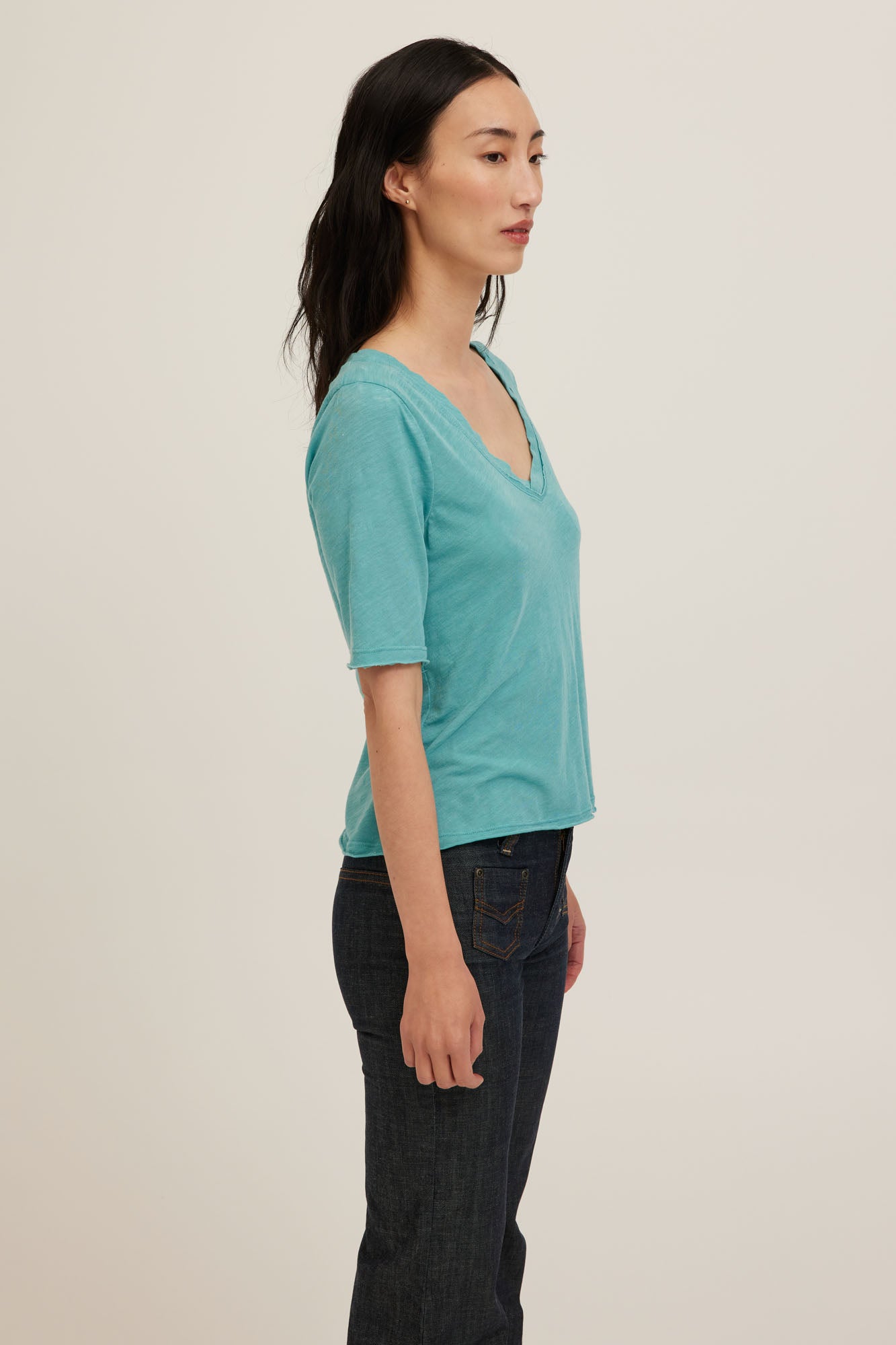 The comfortable everyday go-to. Made from a slub jersey that is ultra-light with a gently transparent finish and a touchably soft handfeel. The Jude Tee is designed with a wide, deep V-neck featuring cross-stitch detail, raw edges at the neckline and hem, elbow sleeves, and a waist-length cut. It drapes fluidly with a relaxed fit. Easy to layer or wear on its own and moves with you.
