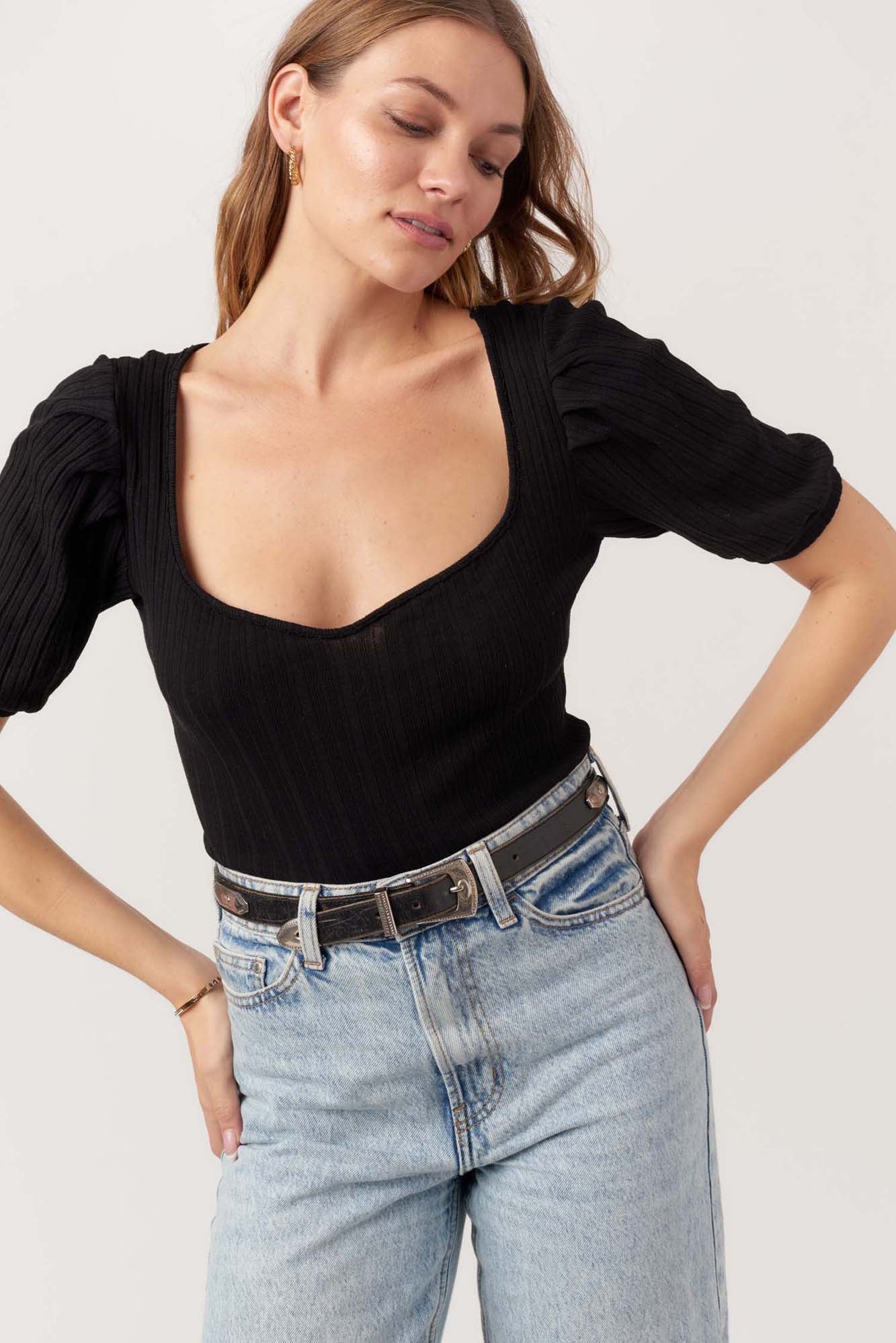 Our Wildest Dreams Sweetheart Neck Rib Tee is crafted from 100% cotton in a ribbed knit that gives subtle structure. Designed with a sweetheart neckline and puff sleeves, it creates a feminine shape with just the right amount of drama. A fitted silhouette makes it an easy go-to for dressing up your everyday look.