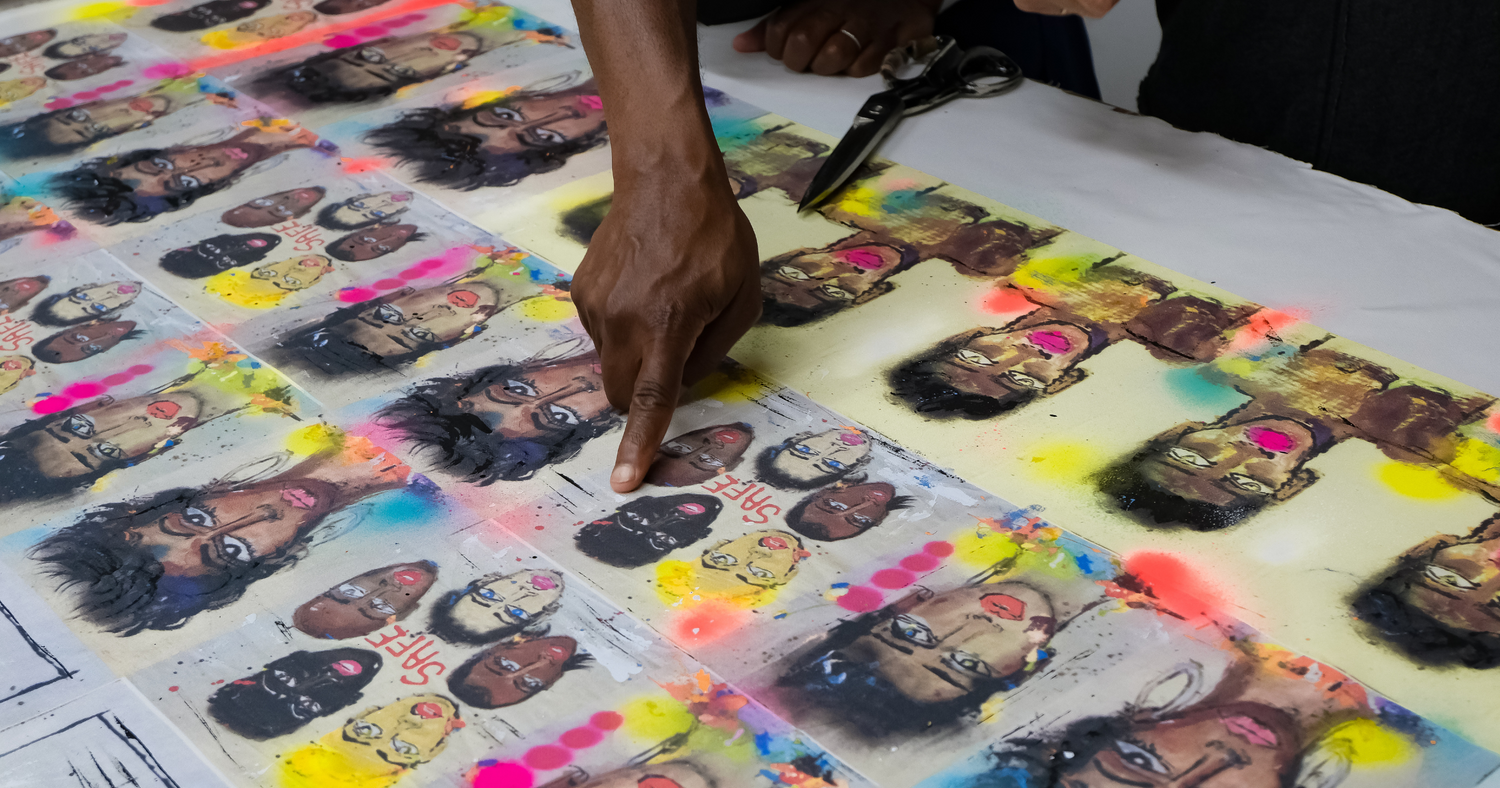 “I love telling stories about people and relationships in my wearable art. It’s about bursts of color thrown against faces of different races and expressive eyes, along with positive messages conveyed through text.” For him, every element -“every drip or splash” - is intentional. Even the happy accidents. “This is my community service. Let’s revel in love and positivity and feel-good vibrations.”