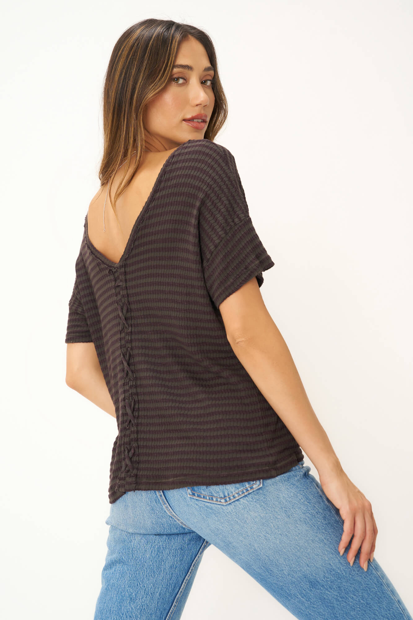 The Isadora Back Lace Up Striped Rib Easy Fit Tee features a relaxed fit, tonal striped rib fabric, scoop front neckline, and drop shoulders, creating an effortlessly comfortable style. The plunge back silhouette paired with the center lace-up detail will make this tee stand out all summer long.