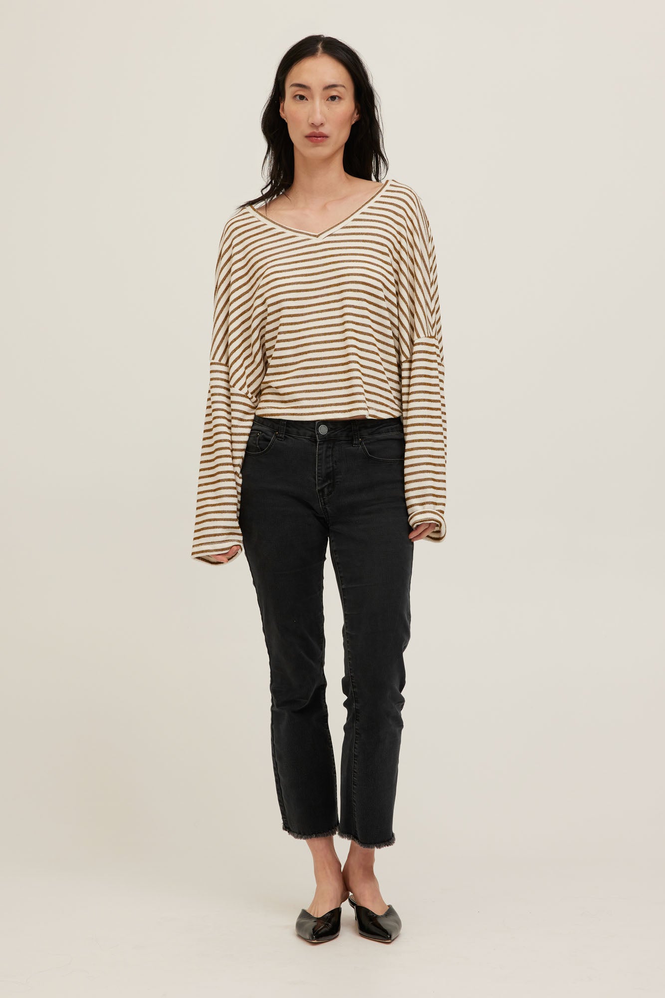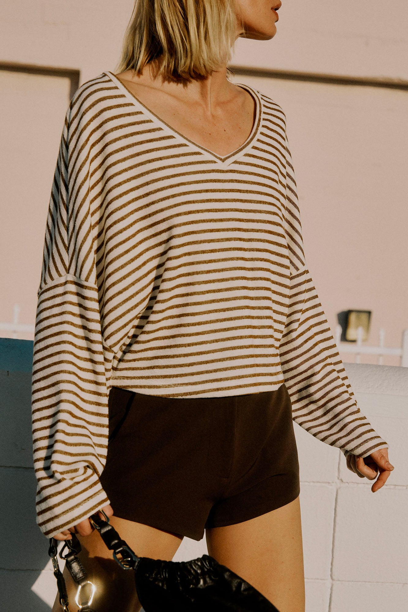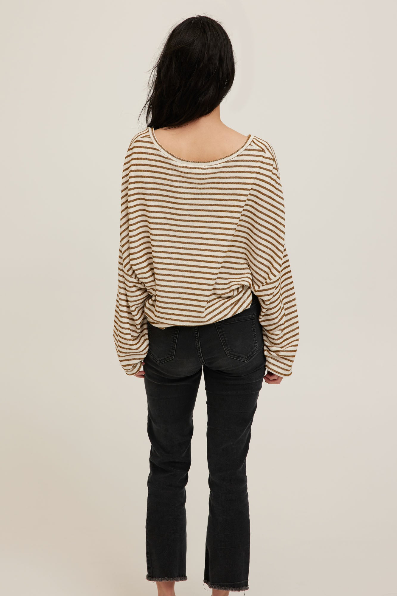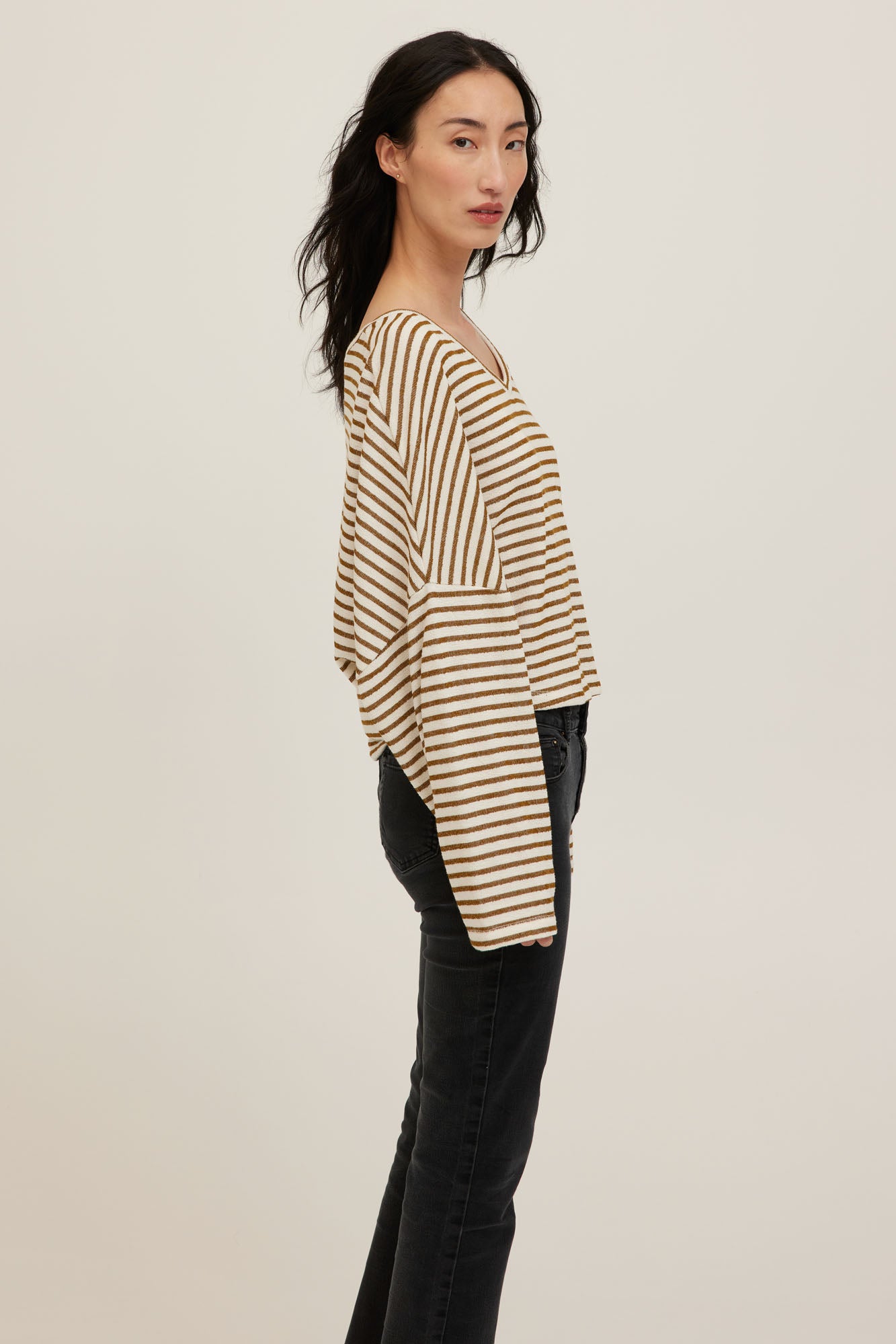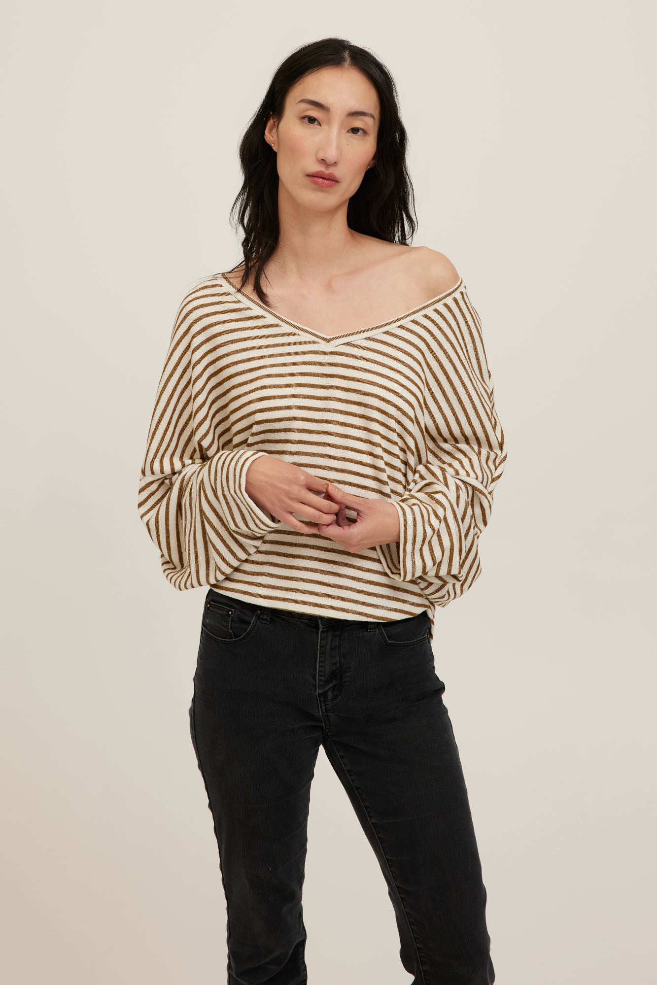 The go-to layer, refined. Made from a mid-weight terry that feels soft and easy to wear. The Ren Stripe Longsleeve is designed with a V neckline, relaxed fit, drop shoulders, and a waist-length cut. Can be worn on or off the shoulder. A striped staple made for day to night wear.