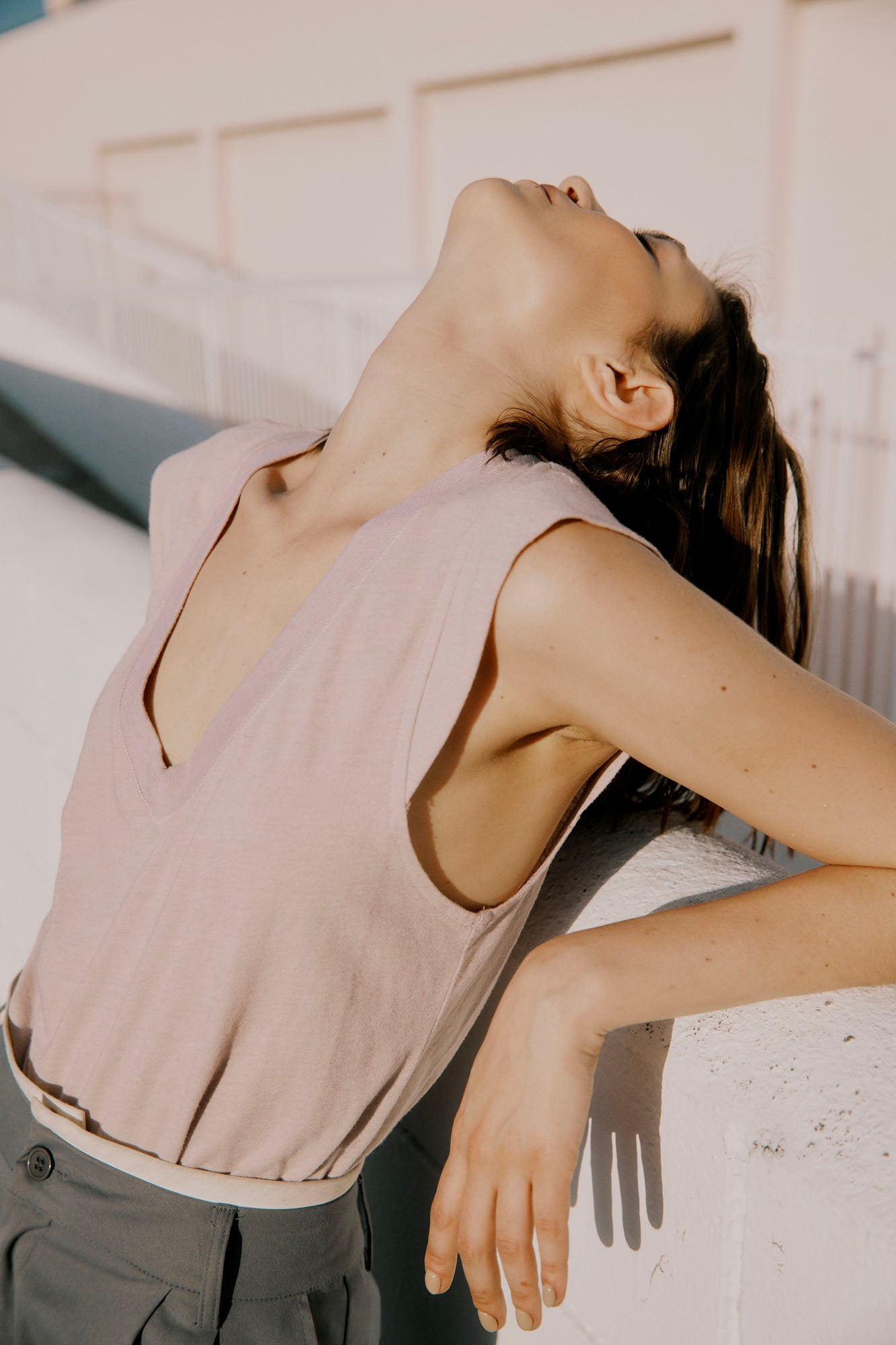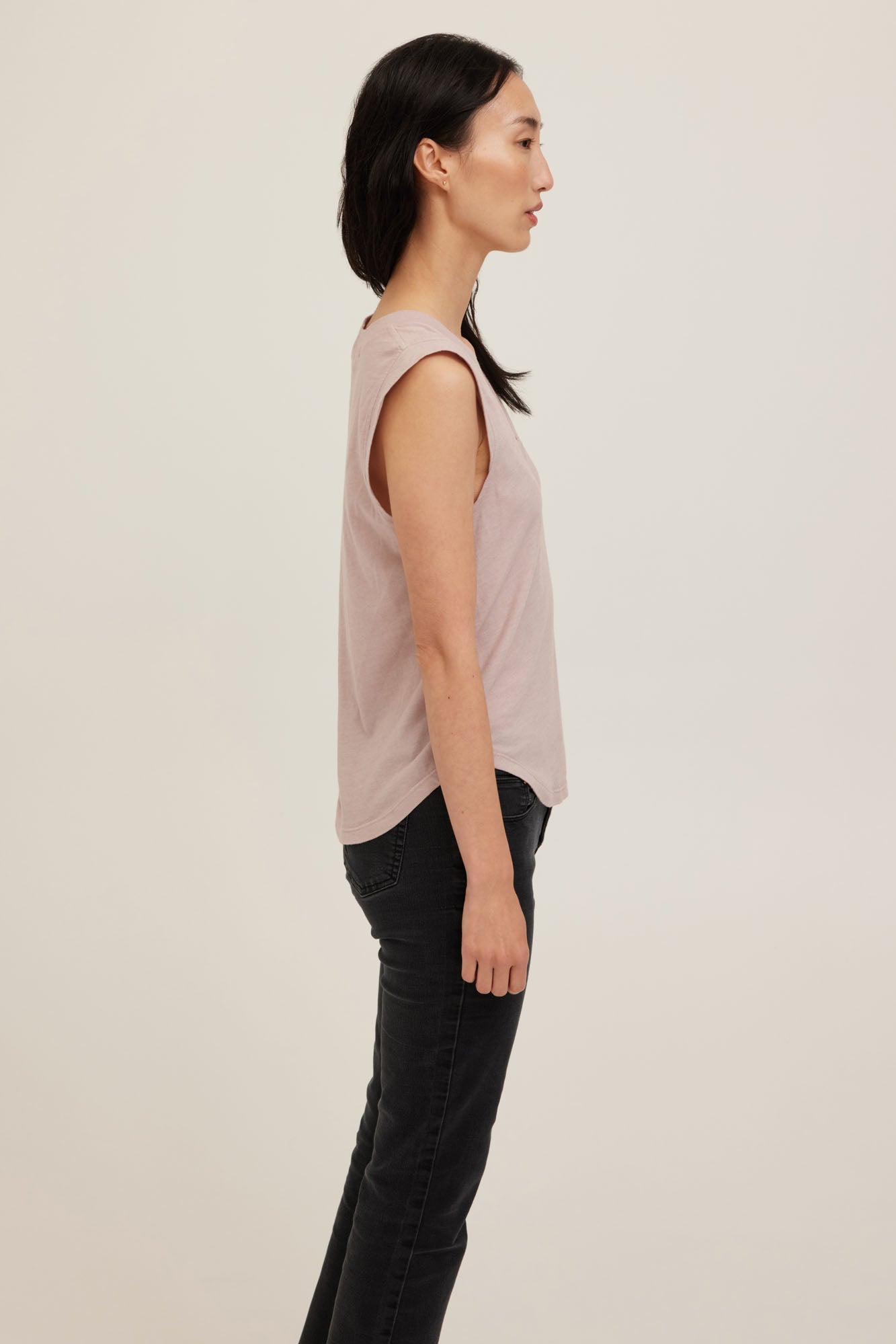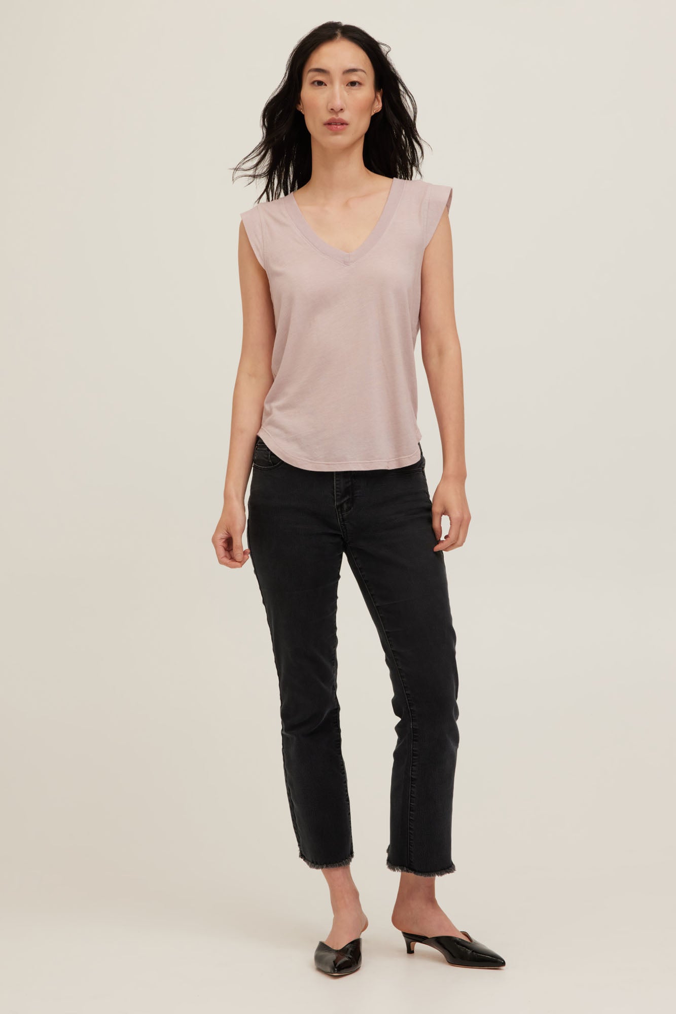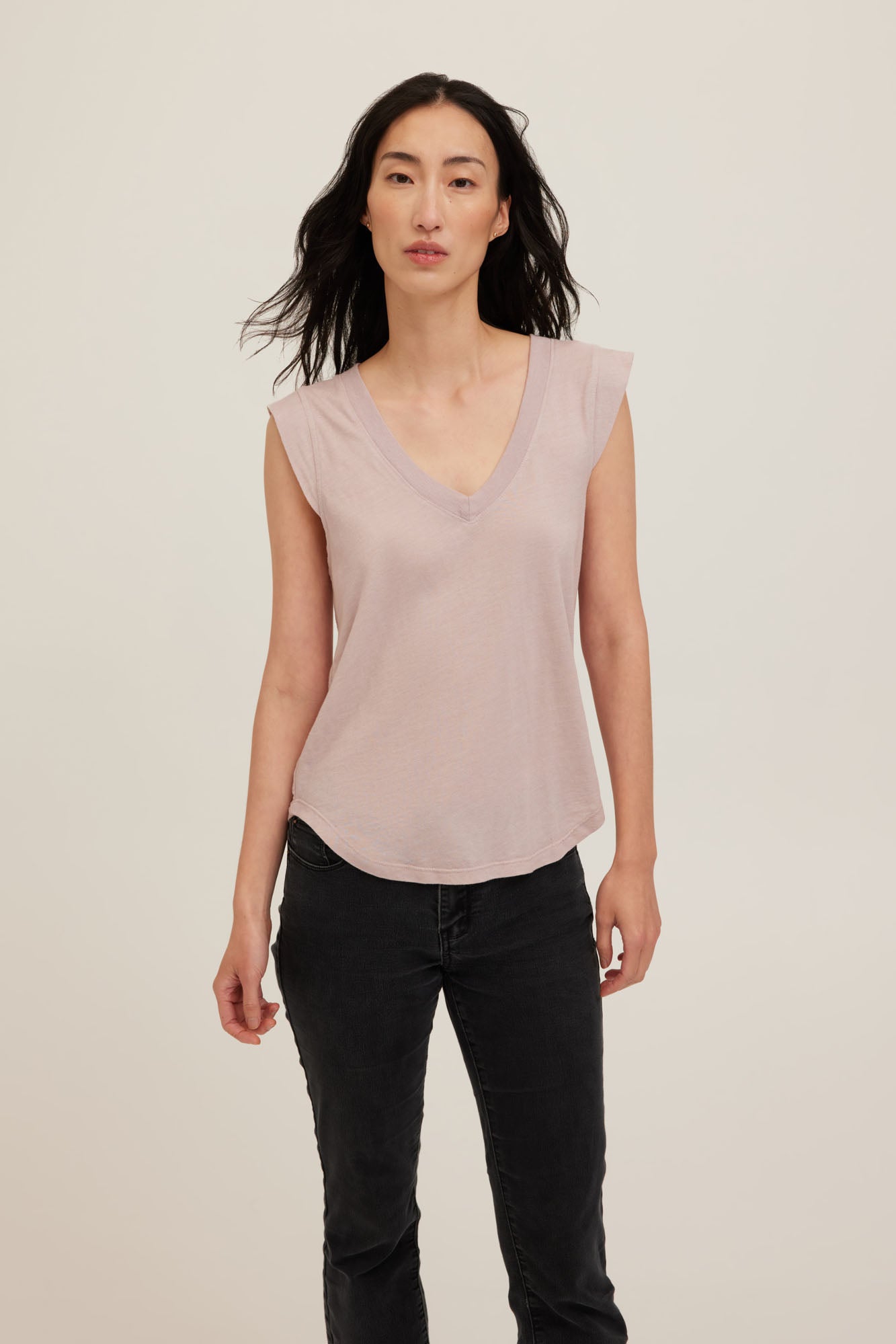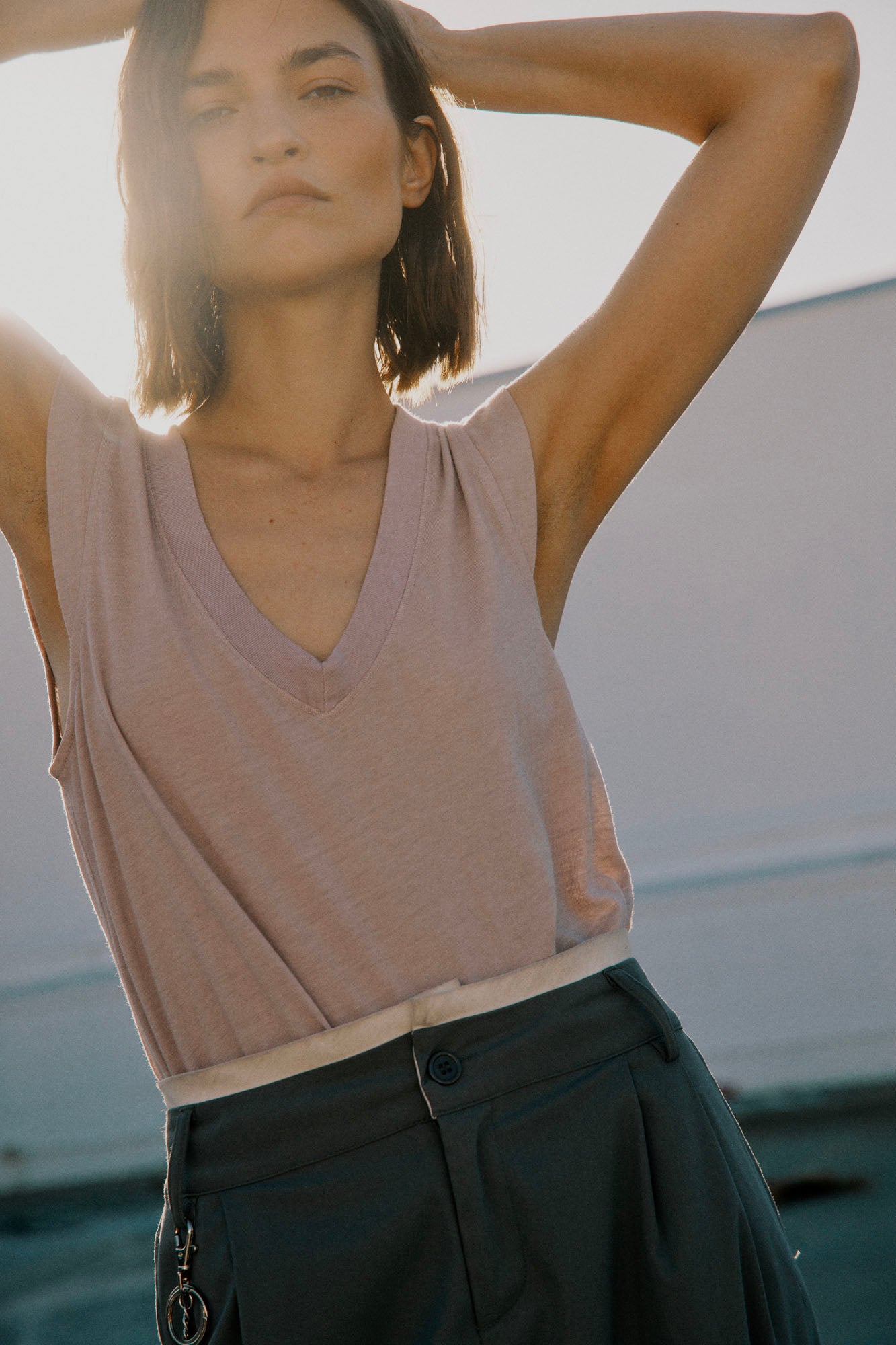 Our go-to everyday tank. Made from a soft heathered jersey fabric with a smooth, lightweight handfeel. Designed in a relaxed muscle-tank silhouette with a clean V-neckline. The Rue falls softly on the body with a simple, streamlined look. Pairs easily with tailoring or layered under knits.